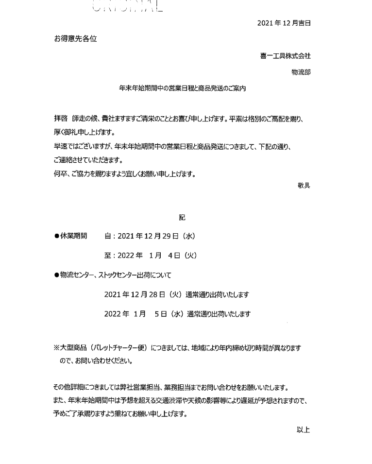 【回覧】年末年始期間中の営業日程と商品発送のご案内(喜一工具株式会社)