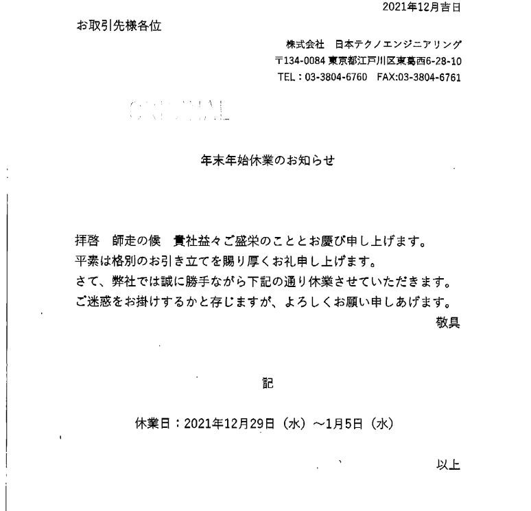 【回覧】年末年始休業のお知らせ(日本テクノエンジニアリング)