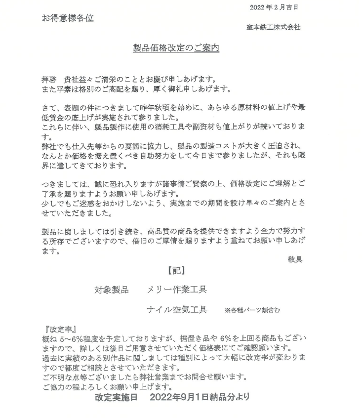 【回覧】製品価格改定のご案内(室本鉄工株式会社)