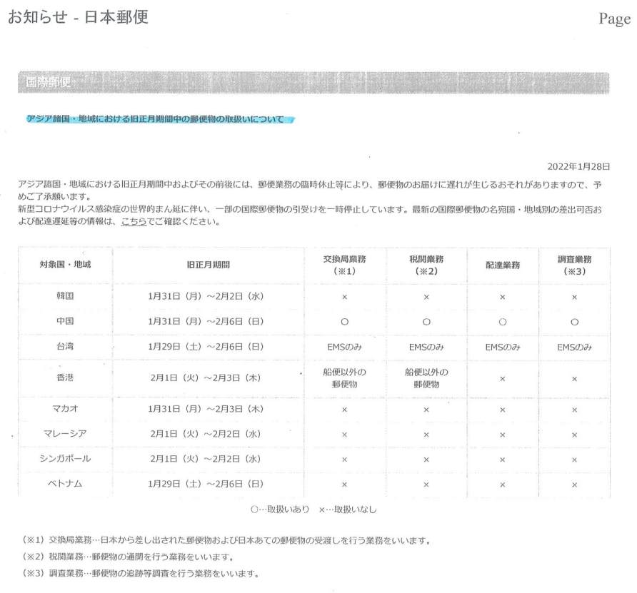 【回覧】アジア諸国・地域における旧正月中期間中の郵便物の取扱いについて(日本郵便)