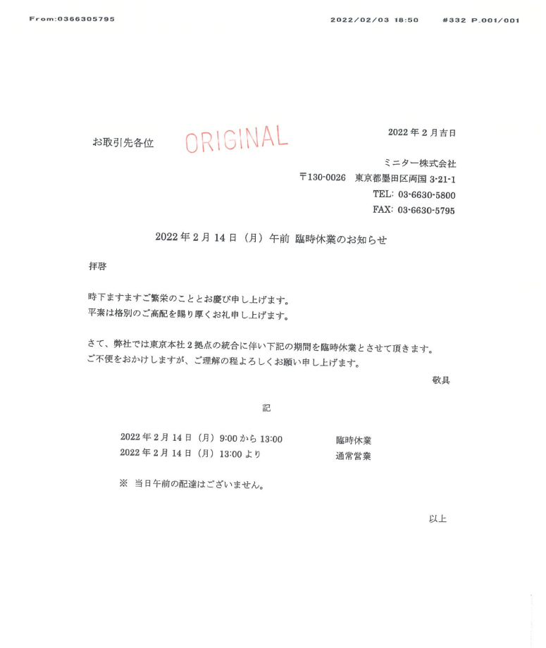 【回覧】2/14(月)午前 臨時休業のお知らせ(ミニター株式会社)