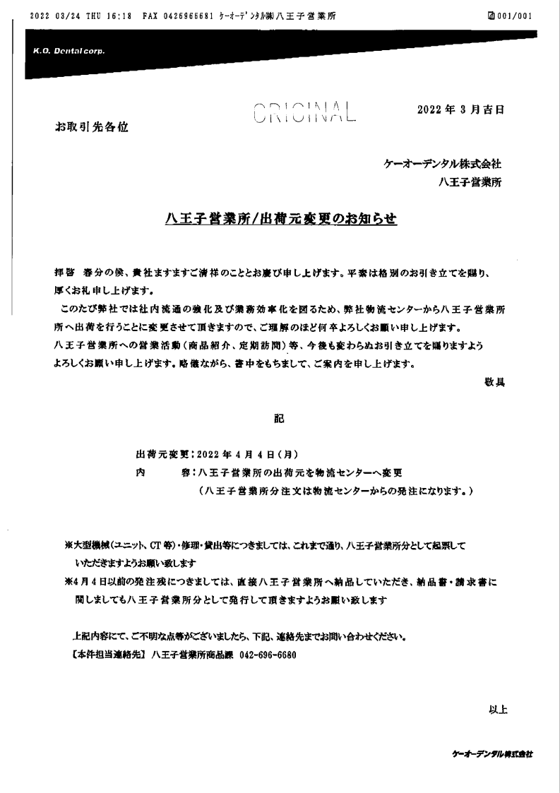 【回覧】八王子営業所/出荷元変更のお知らせ(ケーオーデンタル株式会社 八王子営業所)