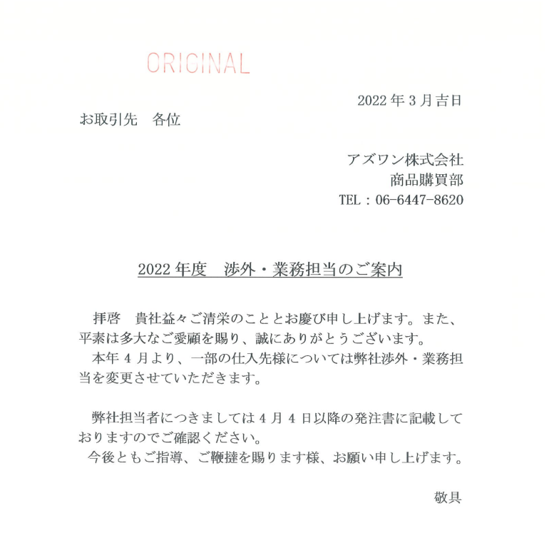 【回覧】2022年度 渉外・業務担当のご案内(アズワン株式会社)