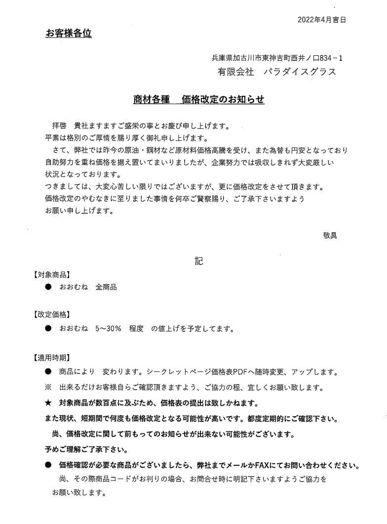 【回覧】商品各種 価格改定のお知らせ(有限会社パラダイスグラス)