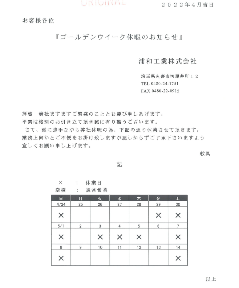 【回覧】ゴールデンウィーク休暇のお知らせ(浦和工業株式会社)