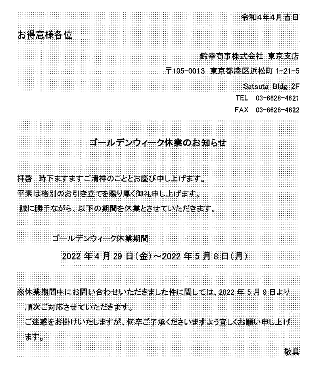 【回覧】ゴールデンウィーク休業のお知らせ(鈴幸商事株式会社)