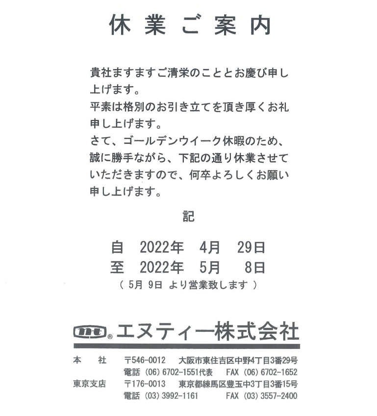 【回覧】ゴールデンウィーク休業のお知らせ(エヌティー株式会社)