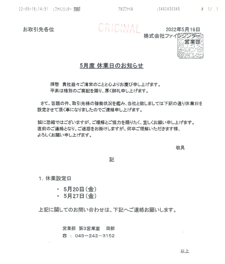 【回覧】5月度休業日のお知らせ(株式会社ファインシンター営業部)